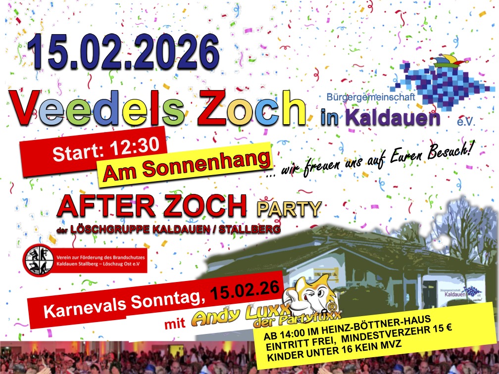 Am Sonntag, 15. Februar 2026 startet um 12:30 Uhr an der Lendersbergerstraße wieder der Kaldauer Veedelszoch. Die Aufstellung der Zugteilnehmer ist um 11:30 Uhr. Der Zugweg verläuft wie im letzten Jahr: Lendersbergerstraße – Im Donnerschalg – Kningelbach – Lendersbergerstraße – Buchenweg – Hauptstraße – Paul-Moog-Straße.