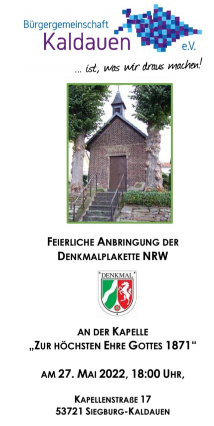 Feierliche Anbringung der Denkmalplakette NRW an der Kapelle “Zur Höchsten Ehre Gottes 1871″