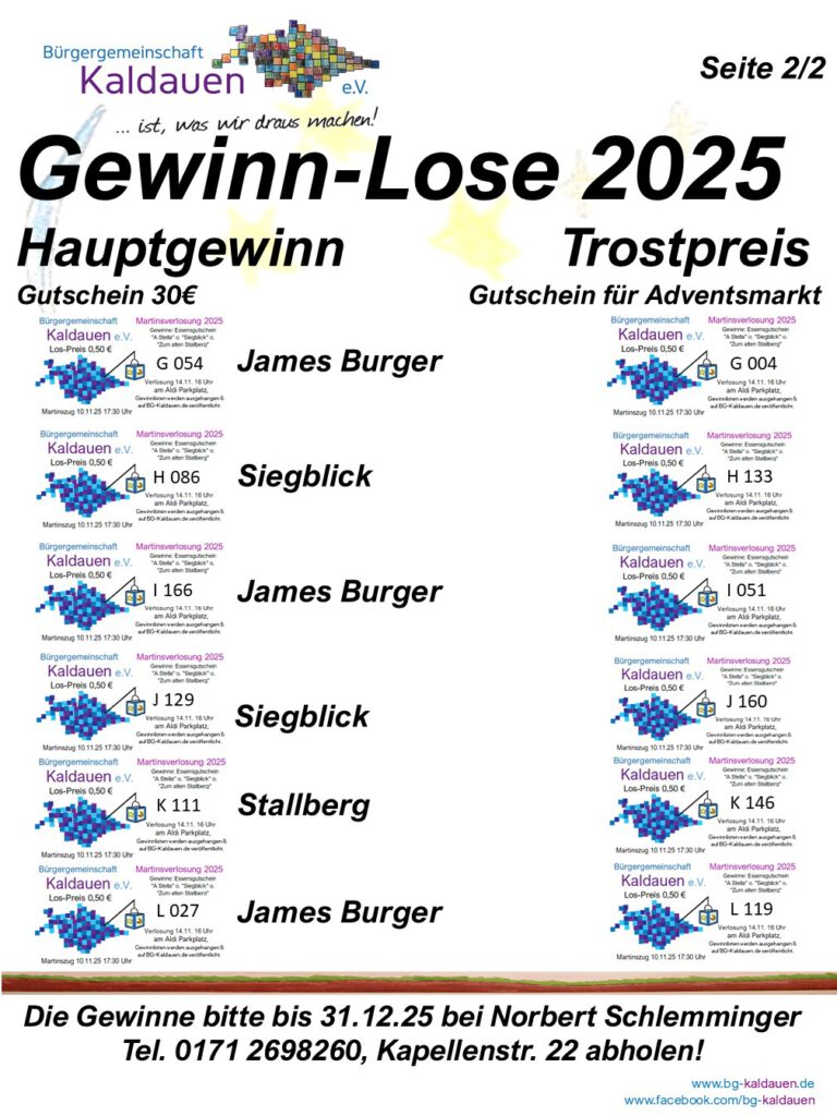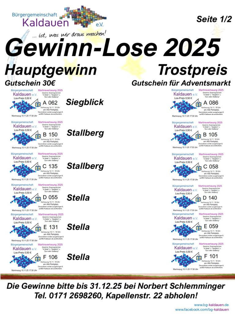 Martinslose 2025 – Gewinnlose 17/11/202517/11/2025 Gewinnlose weisen jeweils die passende Buchstabe/Zahl Kombination auf. Gewinne können unter Vorlage des Loses bis zum 31.12.2025 hier abgeholt werden: Norbert Schlemminger Kapellenstrasse 22 Telefon 0171 2698260